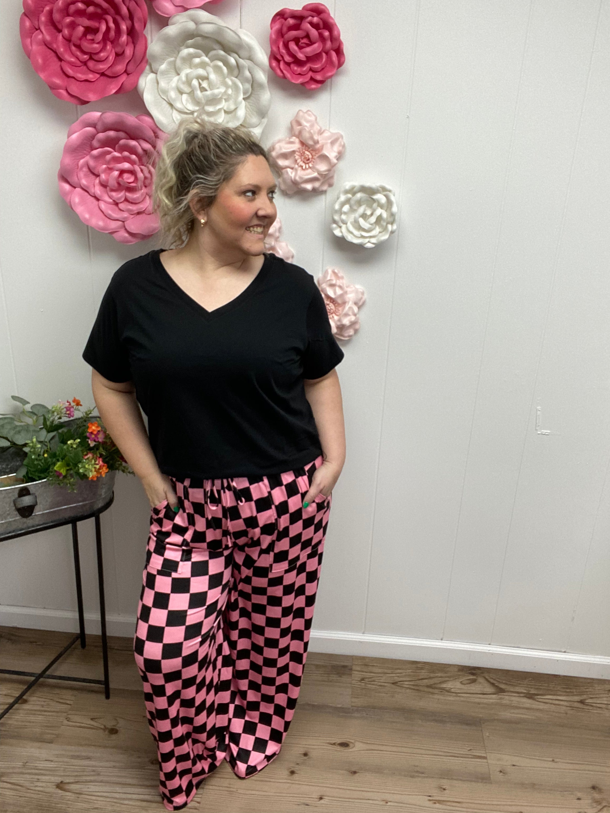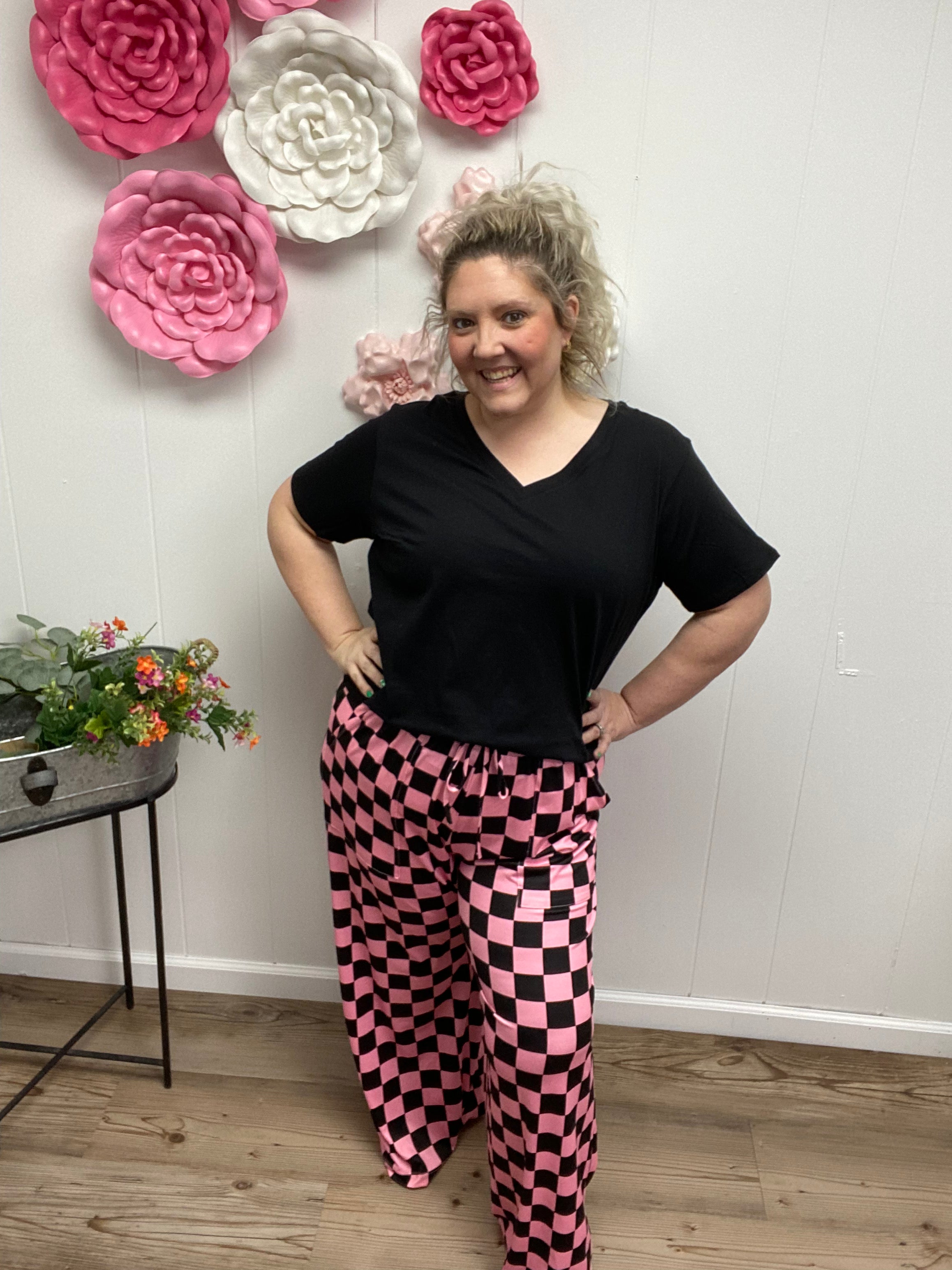 These casual wide leg elastic waist pants are soft, stretchy and airy. They come in the cutest pink and black checker print and has pockets. Pair with a graphic tee and jean jacket for spring or a tank for summer because they are thin enough for warmer weather.